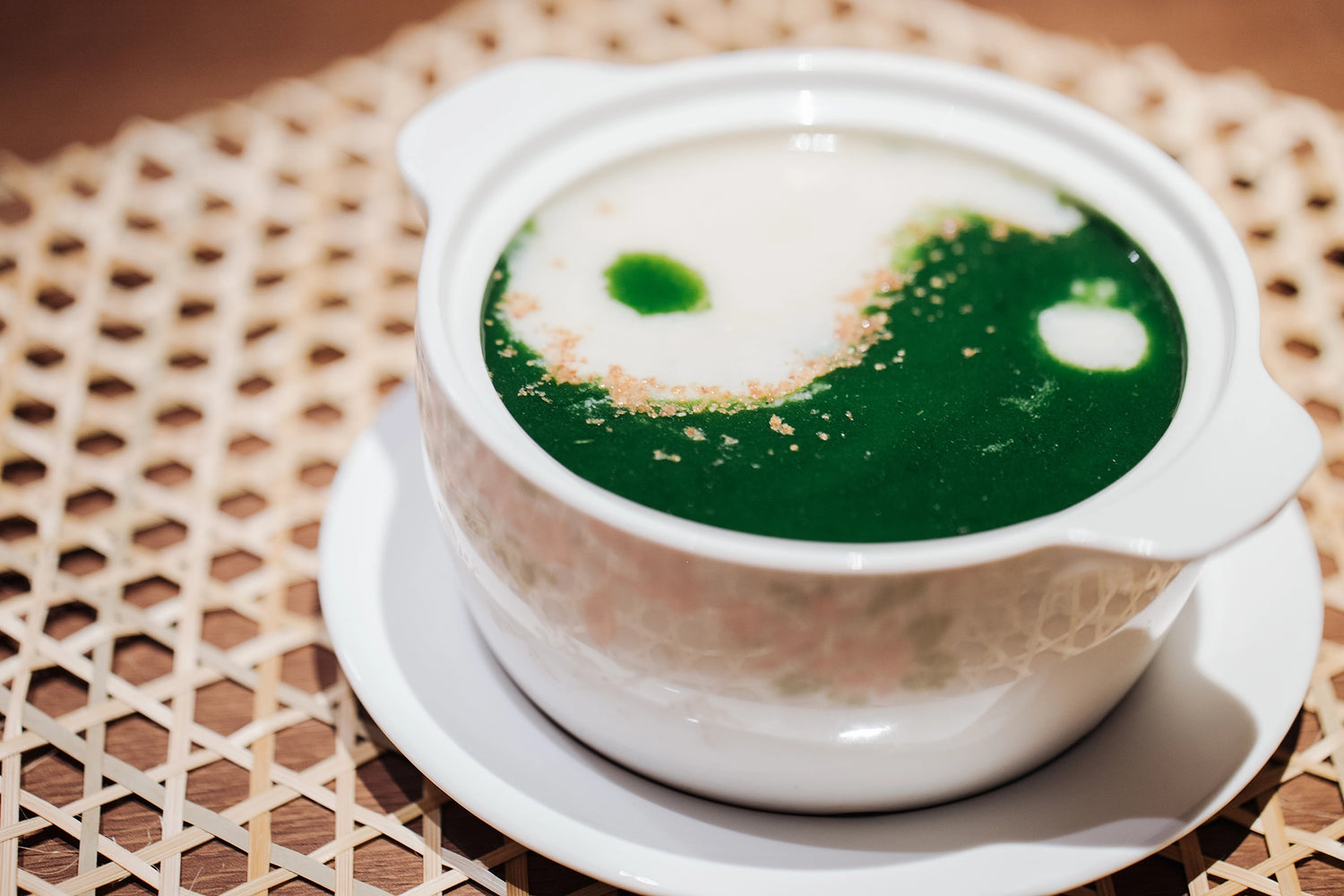 Puréed Vegetable Soup with Egg White is our standout offering at Moon Lok Chiu Chow. This soup is as visually stunning as it is delicious, featuring a yin-yang pattern created by vibrant green and creamy white colors. Made from spinach and broth blended into a smooth puree, and enhanced with chicken and egg white for added depth of flavor, this soup embodies the balance of yin and yang. It's a light and nutritious choice that symbolizes harmony and vitality in every spoonful.