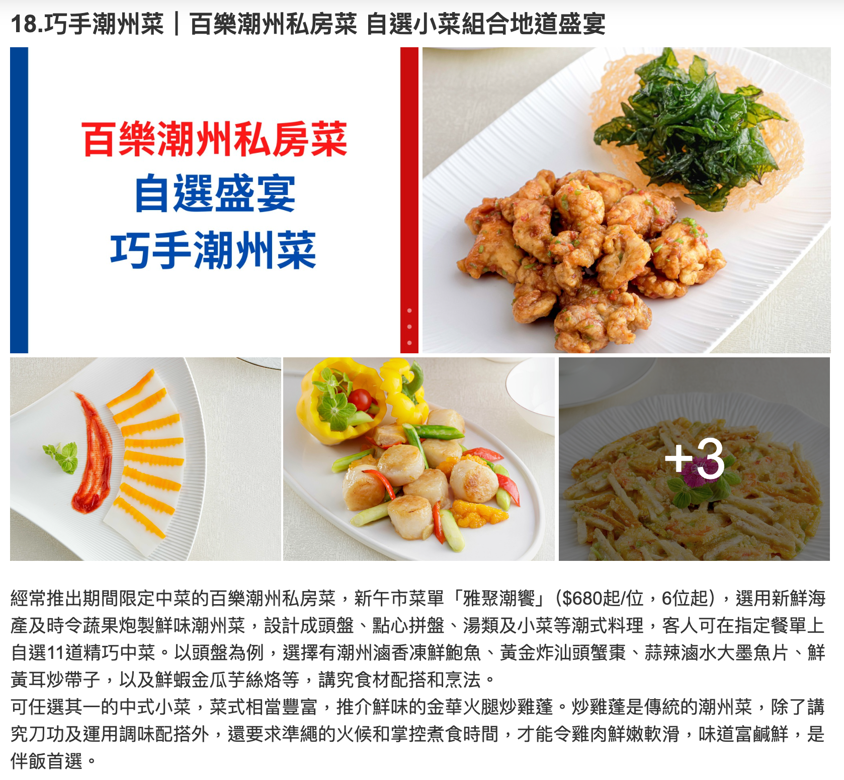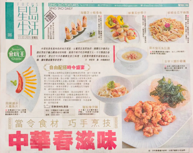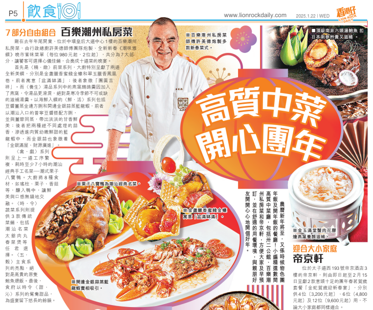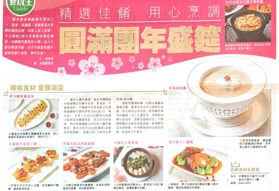 正宗潮州食府百樂潮州及旗下子品 牌滿樂潮州共推出三款全新賀年菜單,以一系列好運菜式迎接新正頭。